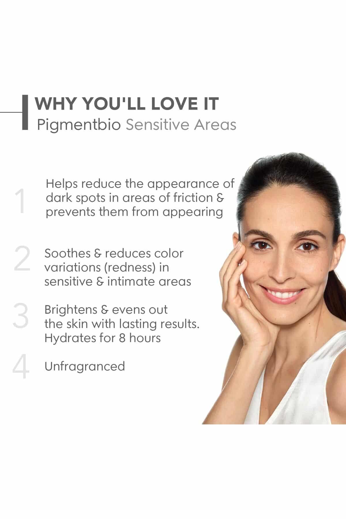 عالجي فرط التصبغ في المناطق الحساسة باستخدام بيجمنتبيو للمناطق الحساسة، تركيبة متخصصة تُفتّح البقع الداكنة في المناطق الحساسة من الجسم بلطف مع مراعاة حساسية البشرة.