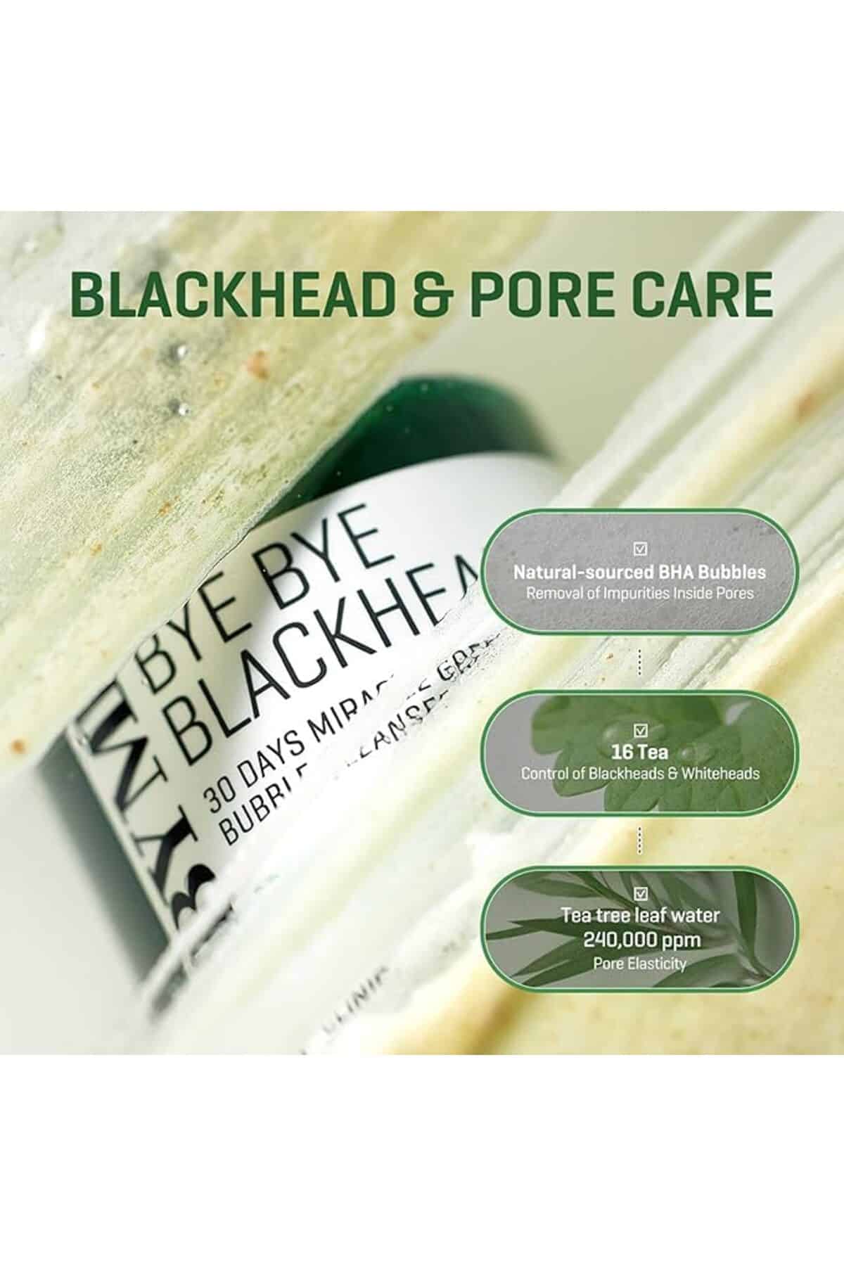 تخلص من الرؤوس السوداء بفعالية مع منظف الفقاعات الرائع “باي باي بلاك هيد 30 دايز ميراكل” بالشاي الأخضر، الذي يتميز بتقنية الفقاعات ومستخلص الشاي الأخضر الذي ينظف المسام بعمق ويقلل الرؤوس السوداء في 30 يومًا.