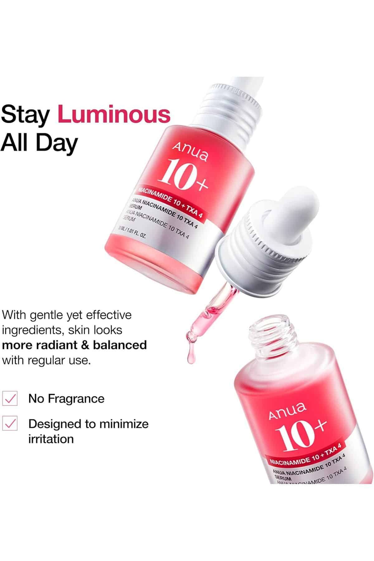 Product Description Experience premium brightening with the 10% Niacinamide + 4% Tranexamic Acid Serum , designed to target dark spots, uneven tone, and skin discoloration while strengthening the moisture barrier.