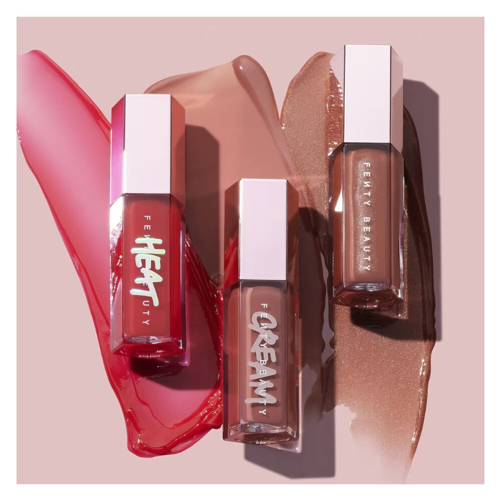 Fenty Beauty Heat Gloss contains moisturizing Shea Butter and Vitamin E for a hydrated, high-shine finish.