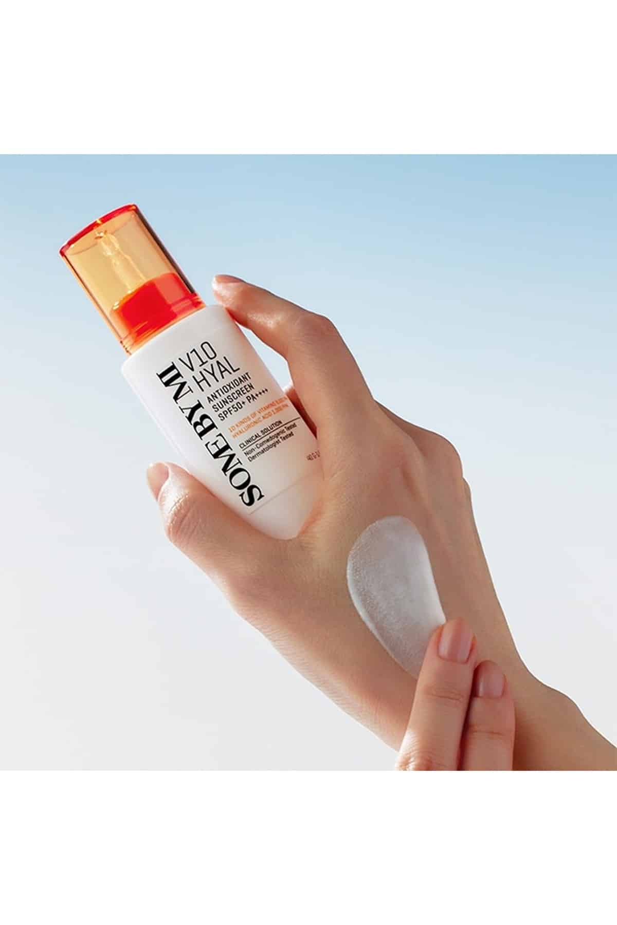 Multi-defense with V10 HYAL SPF50 Sunscreen Antioxidant – Protective and Nourishing, combining high SPF50 protection with vitamin complex and hyaluronic acid to defend against UV damage while providing antioxidant protection and hydration.