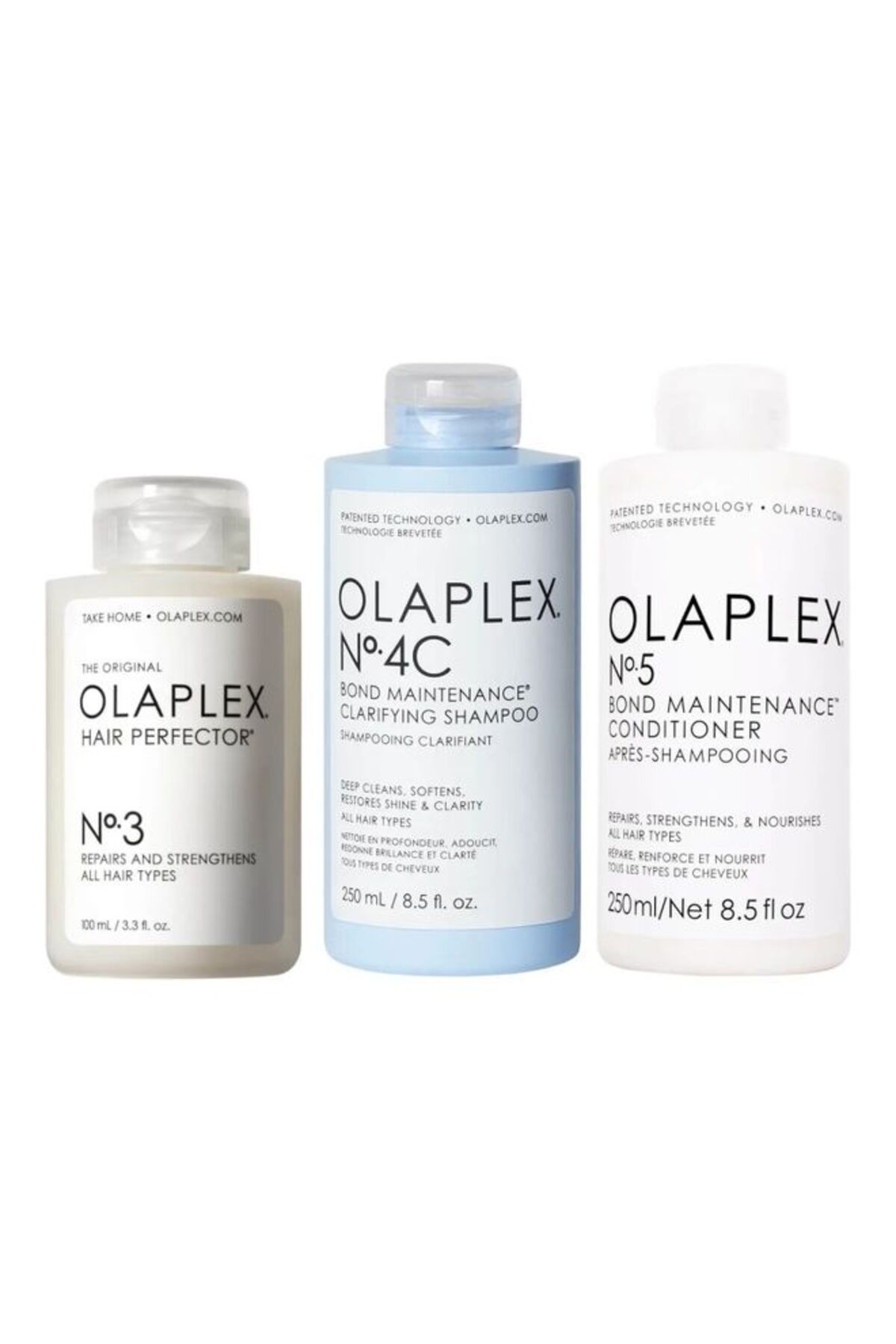 Complete bond care system with No 3 Hair Perfector, No 4C Clarifying Shampoo & No 5 Bond Conditioner – Ultimate Repair Trio, providing comprehensive bond repair, deep cleansing, and intensive conditioning for transformed hair health.