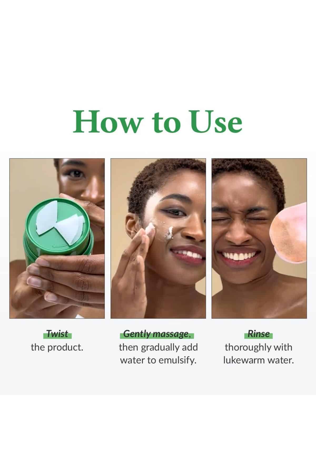 Massage balm onto dry face, add water to emulsify, then rinse thoroughly.