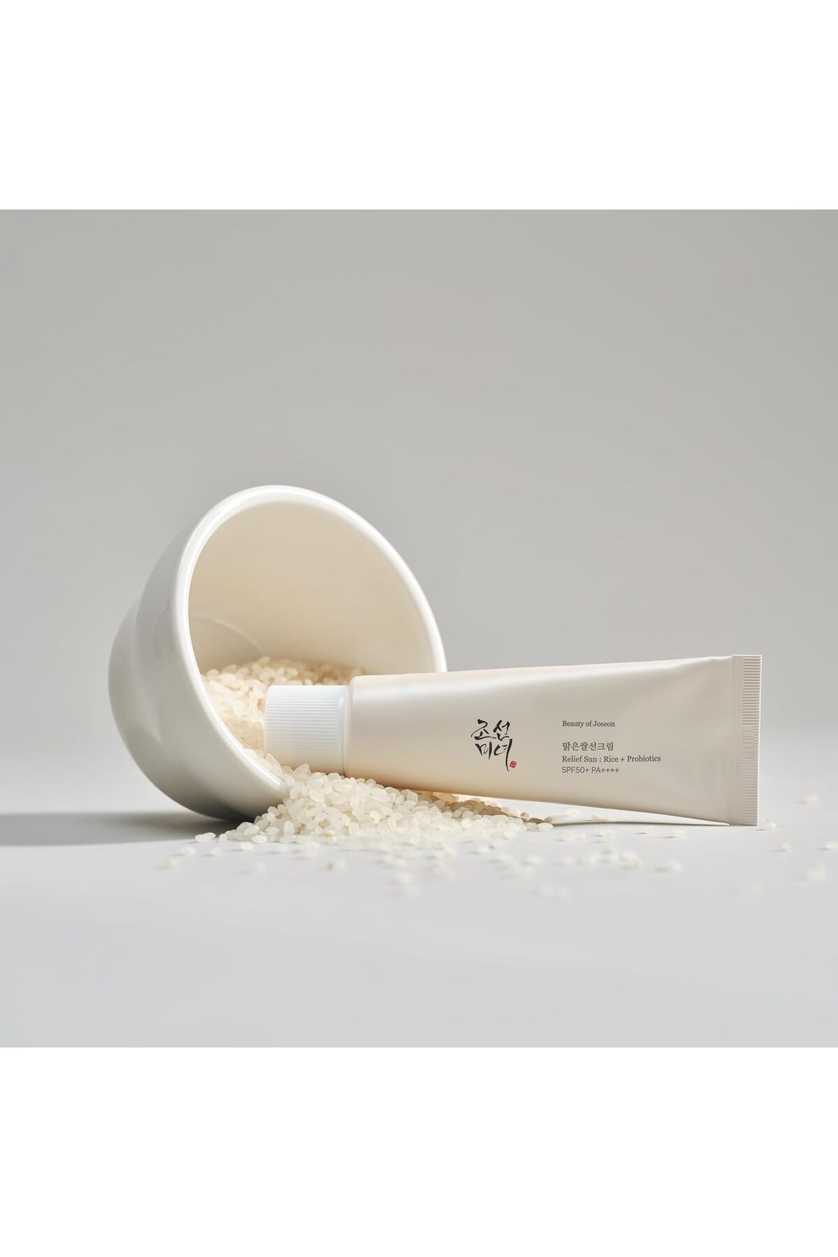 Innovative protection with Relief Sun Rice Probiotics SPF50 50ml, combining rice, probiotics, and chemical filters for comprehensive care.